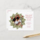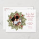 Este diseño presenta Feliz Navidad con alegre corona navideña con una moderna familia de fotos 1 diseño de imagen, elegante familia simple minimalista, escritura rústica de tipografía verde roja, hojas de pino botánico de moda, escritura de pincel elegante, ramas de vegetación de color de agua simple, Navidades bayas vacías rojas vacías, berry holly de follaje de invierno verde, tarjetas de anuncio de Navidad de vacaciones