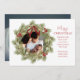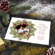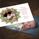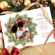 Este diseño presenta Feliz Navidad con alegre corona navideña con una familia de fotos moderna 2 diseño de imagen, familia simple y elegante minimalista, escritura rústica de tipografía verde roja, hojas de pino botánico, escritura de pincel de moda, ramas de vegetación de acuarela simples, Navidades bayas vacías rojas vacías, bayas de hojas de follaje de invierno verde, tarjetas de anuncio de natalidad de Navidades