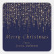 Feliz pegatina navideño con luces de oro y caídas brillantes. El diseño es elegante en azul oscuro y oro. El pegatina puede ser personalizado con un nombre. El pegatina puede ser utilizado como parte de la envoltura de regalo de sus Navidades o como sello para sobres durante el período festivo.