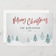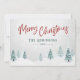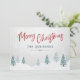Rústicas tarjetas planas de vacaciones de campo con "Feliz Navidad" en un estilo escrito a mano junto con tu nombre o nombres de familia personalizados y el año, todo en tipografía roja y verde pino vintage. Una hermosa vista panorámica de los árboles y de la nieve de invierno en obras de arte de acuarela resalta la parte delantera de la tarjeta. La parte posterior de la tarjeta incluye espacio de texto para su mensaje personal de vacaciones o puede dejarse en blanco para que pueda escribir a mano uno si es necesario. Disponible en material de tarjetas impresas de alta calidad para correo estándar o en formato digital descargable para envío rápido y fácil a través de mensajes de texto, correo electrónico o incluso autoimpresión.