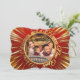 Un moderno diseño de tarjetas de Navidades fotográficos con una foto familiar resaltada dentro de un círculo dorado con emanantes rayos de oro. Este diseño se traslada a la parte posterior para que sus Navidades personalizados saluden, sus nombres y espacio para su nota personal escrita a mano.