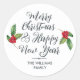 Un moderno pegatina o sello para sobres de Feliz Navidad Feliz Año Nuevo con una caligrafía de escritura elegante y fuera de negro y una tipografía simple y elegante sobre un fondo blanco con un toque de humedad y bayas. Diseñado exclusivamente para usted por Happy Dolphin Studio!