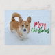 Esta hermosa tarjeta de Navidad de Corgi presenta una bonita foto invernal de un Pembroke Welsh Corgi rojo y blanco con cola, de pie en la nieve junto a una elegante tipografía que dice Feliz Navidad. Tarjetas postales navideñas adorables para amantes de los perros.