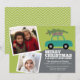 Un moderno saludo de vacaciones con el ilustracion de un coche que mueve regalos y un árbol.