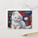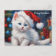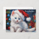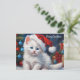 Un gato lindo en un sombrero de Papá Noel sentado cerca de árboles de Navidad