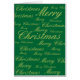 Un fondo verde brillante con las palabras Feliz Navidad en oro y en diferentes tamaños cubriendo la tarjeta. Una carta de Navidades simple y elegante.