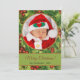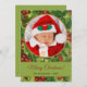 Sobre un fondo de hueso vintage con hojas verdes y bayas rojas, hay un renglón redondo de una foto de un bebé, en un círculo dorado. Bajo él, en una franja verde con bordes dorados, el deseo "¡Feliz Navidad!" está escrito en un elegante guión caligráfico rojo y el nombre y el año en gorras más pequeñas, con un verde oscuro. La parte posterior es verde con un mensaje más largo escrito con la misma letra elegante, pero con blanco. La foto de un marcador representa a un bebé dormido vestido de rojo, como Santa Claus, pertenece a Petr Kratochvil de Public Domain Pictures; es gratis para uso comercial y tiene lanzamiento de modelo. El fondo hueco es de una vieja tarjeta de felicitación vintage de 1909, publicada por Raphael Tuck & sons, que ahora es de dominio público (fuente: TuckDB).