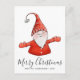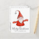 Crea postales adorables Navidades personalizados con saludos navideños Feliz y gnomo alegre con ropa roja festiva sobre un fondo blanco. El texto de la plantilla facilita la personalización con el nombre de su familia, la dirección y un mensaje. En la parte de atrás está decorado con sutiles copos de nieve. Felices fiestas!