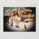 Foto con efecto de pintura, noche de Navidades con estrellas en el cielo. ¿Con un caballo delante de un trineo esperando a alguien, Santa tal vez? En una granja al aire libre con nieve y conejos corriendo libremente en el patio. Un conejo está parado sobre dos pies y "hablando" con el caballo. Con el texto: Feliz Navidad. Parte posterior: plantilla para sus deseos de vacaciones y nombre de familia. Estampilla coincidente disponible.