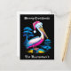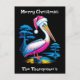 Ilustracion acuático de un pelícano con una paleta de colores vivos de neón. El pelícano lleva puesto un sombrero Santa y es el punto focal. El fondo contiene un baño con cipreses. Toda la imagen se coloca sobre un fondo negro.