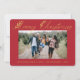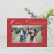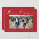 Una hermosa tarjeta de vacaciones con florales en oro deja un texto tipográfico con "Feliz Navidad" en un fondo rojo, y una foto familiar que debes cambiar del menú personalizado, así como el nombre y el mensaje personal.