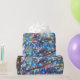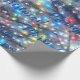 Feliz Navidad, elegante tipografía azul, con un vibrante árbol de Navidad con adornos verdes, rojos, amarillos y azules y un colorido y nevado fondo de cielo nocturno repetiendo diseño de patrón para tu alegría festiva.