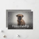 Esta adorable cachorrita rodeada de copos de nieve y el título Feliz Navidad en un suave fondo verde hará sonreír a cualquier amante de las mascotas. Personaliza con el nombre de tu familia y mensaje en la parte posterior. Puedes agregar la foto de tu mascota o mantener esta si lo prefieres.