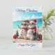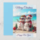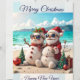 Una tarjeta de vacaciones caprichosa que presenta a dos muñecos de nieve alegres en una playa soleada. Uno