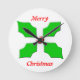 Este impresionante reloj presenta cuatro hojas huecas completas con una baya roja para unirlas. La baya parece brillar en la luz y las hojas tienen una calidad 3D para ellos. El texto rojo en torno a la carpa lee Feliz Navidad.