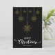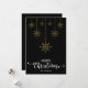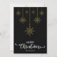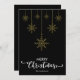 Black Merry Christmas con un guión decorativo elegante y el diseño de copos de nieve dorados colgados. Esta tarjeta de Navidades de color de fondo negro está diseñada para que pueda cambiar el color del fondo. También puede introducir el nombre de su familia o eliminarlo si desea tener el diseño sin el texto. También puede personalizar el color de las palabras "Feliz Navidad" editando este diseño si lo desea.