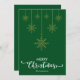 Feliz Navidad Verde con un sofisticado guión decorativo y el diseño de copos de nieve dorados colgados. Esta tarjeta de Navidades de color de fondo verde está diseñada para que pueda cambiar el color del fondo. También puede introducir el nombre de su familia o eliminarlo si desea tener el diseño sin el texto. También puede personalizar el color de las palabras "Feliz Navidad" editando este diseño si lo desea.