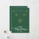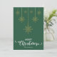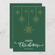Feliz Navidad Verde con un sofisticado guión decorativo y el diseño de copos de nieve dorados colgados. Esta tarjeta de Navidades de color de fondo verde está diseñada para que pueda cambiar el color del fondo. También puede introducir el nombre de su familia o eliminarlo si desea tener el diseño sin el texto. También puede personalizar el color de las palabras "Feliz Navidad" editando este diseño si lo desea.