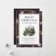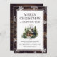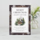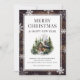 Tarjeta de vacaciones de color acuático rústico con una cabaña de troncos dentro de un marco rústico de madera adornado con copos de nieve. Personalice fácilmente esta nevada tarjeta de vacaciones con su nombre y texto familiar.
