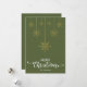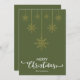 Verde de oliva oscuro Feliz Navidad con un guión decorativo elegante y el diseño de copas de nieve doradas colgando. Esta tarjeta de Navidades de color de fondo verde está diseñada para que pueda cambiar el color del fondo. También puede introducir el nombre de su familia o eliminarlo si desea tener el diseño sin el texto. También puede personalizar el color de las palabras "Feliz Navidad" editando este diseño si lo desea.