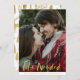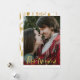 Moderna tarjeta de felicitación de festividad con fotos en un diseño dorado "Feliz Navidad". Personalizado con su foto, saludo y nombres. El reverso de la carta se revierte a un árbol de Navidad dorado y blanco y a un patrón de ciervo en la parte trasera.