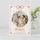 Tarjeta de Navidad inspirada en Coquette con una gran proa roja, una foto personalizado y elegantes letras a mano. Una tarjeta de vacaciones personalizada y festiva con detalles dibujados a mano perfecta para familias modernas.