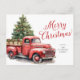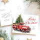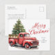 La tarjeta postal navideña navideña de color crudo camionero rojo presenta un camión rojo rústico en la nieve, junto con caligrafía.