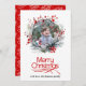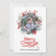 Esta tarjeta de Navidades encantadora cuenta con una corona festiva adornada con bayas rojas y vegetación. La corona, hecha de ramas naturales, se realza con bayas rojas brillantes y hojas de color gris-verde suave. Su foto está rodeada con gracia por la corona, ofreciendo una presentación cálida y acogedora. La tarjeta muestra de manera prominente "Feliz Navidad" en un llamativo rojo, representado con un tipo de letra estilizado. El reverso muestra un patrón del mismo texto estilizado en blanco contra un fondo rojo vibrante.