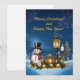 Una tarjeta navideña festiva, perfecta para agregar un toque de alegría navideña a tus regalos, tarjetas o decoraciones. Esta encantadora tarjeta presenta una rama de Navidad bellamente ilustrada adornada con oro brillante, con un simpático muñeco de nieve que te hace sonreír. La escena se completa con un mensaje sincero: '¡Feliz Navidad y próspero Año Nuevo!'. ¡Es la forma perfecta de difundir alegría y calidez en esta época navideña!