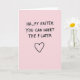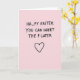 Esta tarjeta se asienta sobre un fondo suave de color rosa que se siente suave e invitante, con un borde coqueto 🌷. Centrado cerca de la parte superior, el texto grueso y negro dibujado a mano dice "HA_PY EASTER", dejando un espacio notable donde debería ir una letra. Justo debajo, el mismo texto negro continúa con "PUEDE INSERTAR LA P MÁS TARDE", convirtiendo la letra que falta en un pequeño empujón juguetón entre amigos cercanos o una pareja 🐰. Las letras se ven ligeramente desiguales y casuales, como una nota rápida escrita con un marcador, lo que hace que la broma se sienta más íntima. El texto negro fuerte resalta bruscamente contra el rosa pálido, manteniendo tus ojos en el mensaje y el espacio en blanco. Más abajo en la tarjeta, un simple contorno de corazón negro se sienta centrado, repitiendo el estilo de línea relajada de las palabras y agregando un toque tierno