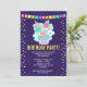 Invitación de cumpleaños con un ilustracion lindo con un quequito y helado sonriendo de alegría. Un arco iris y corazones rodean el dibujo. Una linda nube esponjosa también sonríe con felicidad. El bizcocho y el helado también tienen un cuerno de unicornio de moda encima. Un colorido ilustracion de pancartas se extiende por la parte superior. Confeti colorido a lo largo de los lados. Diseño bonito y adorable lleno de alegría.