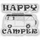 Happy Camper Pegatina es un ilustracion hecho a mano de una camioneta de camping. Las palabras "Happy Camper" están escritas de manera lúdica en un tipo de letra atrevida y divertida, irradiando positividad y aventura