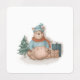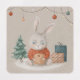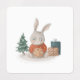 Feliz Navidad y feliz tarjeta de bienvenida de año nuevo con lindo conejito en una acogedora alfombra con regalos y árbol de vacaciones
