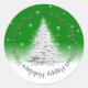 Este Pegatina Verde de Felices Fiestas presenta un árbol de navidad blanco y copos de nieve con Felices Fiestas en Plata.