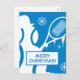 Feliz postales navideños con un bonito diseño de snowman de tenis. Excelente para tenis, entrenador, instructor, maestro, capitán, niños, etc. Fun Holiday postales con saludo personalizado o mensaje para amigos y familia. Impresión divertida con pelotas de tenis hechas de nieve. También es práctico para cambiar de dirección, nueva casa, reubicación, mudanza, negocios, tienda, empresa, oficina, fiesta infantil en invierno etc. Combinación de colores azul y blanco.