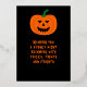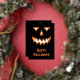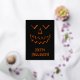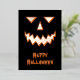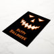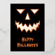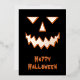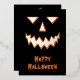 Un temible diseño de cara de calabaza en un fondo negro. El frente tiene una cara de Relieve metalizado y "Halloween feliz" con una sombra/resaltado naranja. La espalda tiene una linterna de calabaza naranja con un mensaje espeluznante.