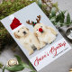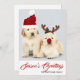 Este diseño navideño presenta una foto de dos cachorros de Golden Retriever que llevan sombreros rojos de Navidad y el texto "Saludos de la Temporada" escrito en tipografía roja popular con un nombre de familia añadido debajo. La parte posterior de la tarjeta tiene un dibujo animado de un reno festivo. Para personalizar, puede agregar su propia foto y editar el texto.