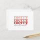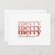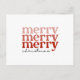 Esta cédula de postales festiva tiene el texto Merry, Merry en tonos rosados y rojos así como los Navidades de texto en negro. Esta tarjeta de estilo clásico y retro le da un gran toque personalizado a sus saludos de temporada. (El color blanco de fondo puede cambiarse según sus preferencias, sólo vaya al área de personalización.)