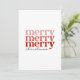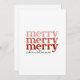 Esta carta festiva tiene el texto Merry, Merry en tonos rosas y rojos, así como los Navidades de texto en negro. Esta tarjeta de estilo clásico y retro le da un gran toque personalizado a sus saludos de temporada. (El color blanco de fondo puede cambiarse según sus preferencias, sólo vaya al área de personalización.)