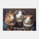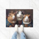 Esta alfombra de puerta presenta una imagen cautivadora que ofrece un giro caprichoso en el retrato renacentista clásico. Cuenta con tres majestuosos conejillos de indias, cada uno adornado con coronas de oro en miniatura, que exudan un aire de nobleza y sabiduría. Están vestidas con suntuosas túnicas de inspiración renacentista, con ricos tonos azules y dorados que resaltan sus patrones individuales de piel y colores. Enmarcado en un fondo monótono y ornamentado que da a entender la grandeza de una época pasada, esta pieza logra un equilibrio entre majestuosa elegancia y peculiaridad con encanto. generativo y concordante