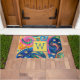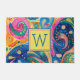 Esta alfombra de puerta monogramada es bonita y presenta un patrón abstracto geométrico brillante y colorido en tonos rosas, azules, verdes y amarillos. Personalice el monograma con su elección inicial.