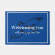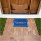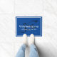 La estera de puerta de la felpa se muestra en azul y tiene una frontera y un texto blancos. El texto lee "acogerle con satisfacción con paz, alegría y amor". Tiene un esquema de una paloma detrás de ella.