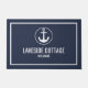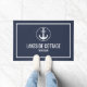 Bienvenidos visitantes con este ancla náutica de vacaciones alquiler de alfombra doormat con tipografía moderna en blanco sobre un fondo azul marino. Añada su nombre personalizado de alquiler de vacaciones a este elegante felpudo, perfecto para una cabaña de playa, alquiler de casas en el lago o airbnb.