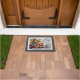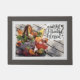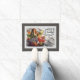 La cita inspiradora otoño doormat representa una cesta rodeada de coloridas calabazas otoñales y hojas amarillas en un parqué de madera gris clara. Incluye las motivadoras palabras, "Agradecimiento Bendecido."