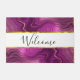 Un portero de bienvenida con un diseño abstracto elegante. Color amatista morado oscuro con cintas de oro enclavadas entre estratos de capas. Diseño rico y hermosoEncaramado sobre la parte superior, se encuentra un rectángulo blanco con un borde falso de Relieve metalizado dorado, con bienvenida escrita en el interior.