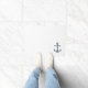 Moderna Mat de Puerta Náutica Minimalista con ancla azul marino sobre fondo blanco. Perfecto como decoración de casa de playa, regalo de bienvenida y más.