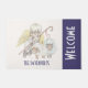 Doormat de bienvenida personalizado diseñado con un ángel sereno con alas amarillas sosteniendo a los pastores. Sentado al lado de 2 corderos blancos esponjosos.
