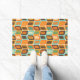 Este doormat tiene un diseño moderno de mitad de siglo de rectángulos redondeados inclinados hacia el lado con rectángulos inclinados dentro hechos de líneas todo en colores de los años 70.