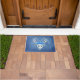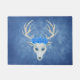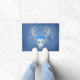 Esta alfombra exterior de la puerta de bienvenida es una mezcla de tonos azules con una mítica cabeza de ciervo blanco con grandes cuernos y tres rosas azules de bonito.