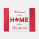 Doormat rojo y blanco que acoge con satisfacción a sus huéspedes a su hogar con el O en el hogar substituido por una hoja de arce. ¡Añada su apellido también!